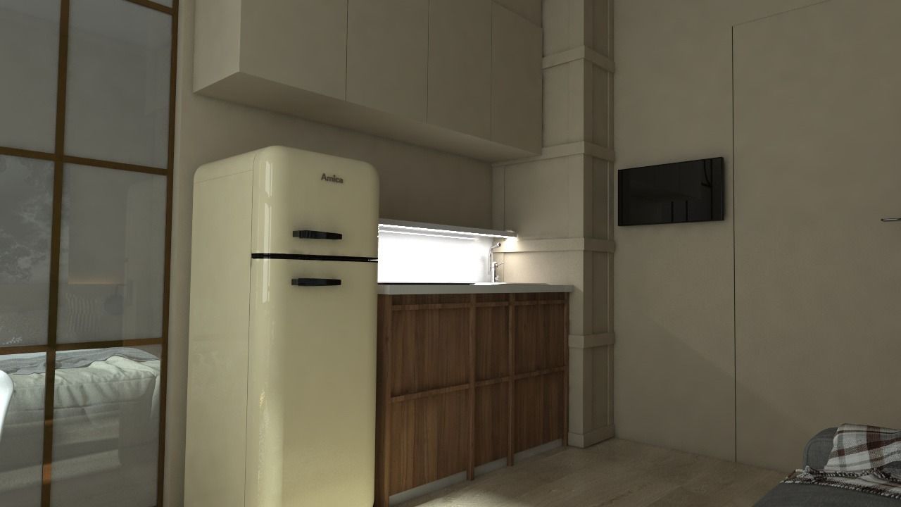 Se mantiene la memoria del edificio manteniendo vivas las curvas de sus paredes, el tono y terminado de los paramentos verticales y se restauran algunas piezas de pavimento hidráulico existentes. Se mantiene la altura de los techos a 2,90 y se genera un ambiente cálido mediante la  cromática y el uso de materiales claros.