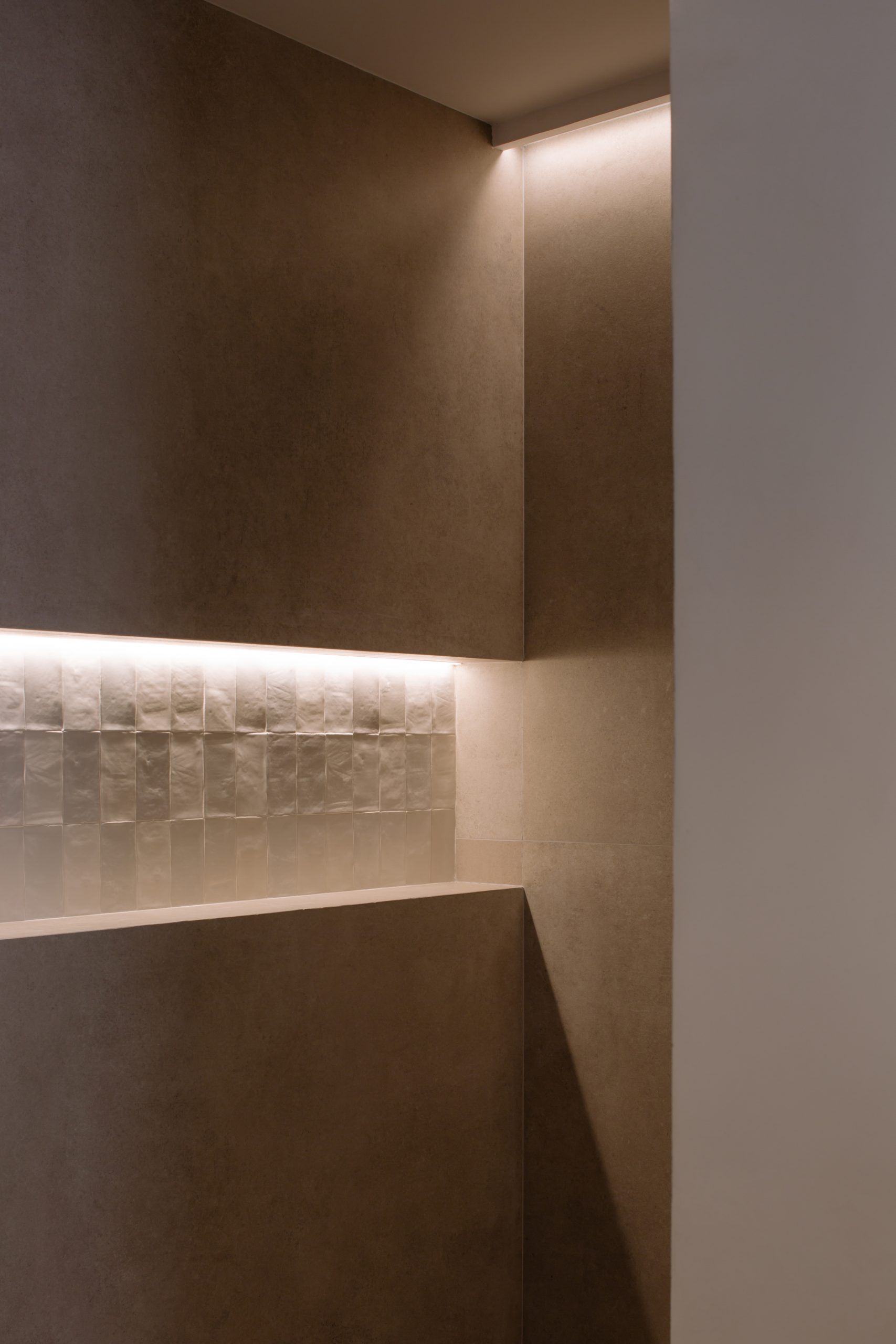 Los baños siguen la línea conceptual del proyecto: materiales continuos, tonos vainilla y una atmósfera cálida. El fondo pétreo y homogéneo se enriquece con la textura visual de azulejos artesanales en acabado mate y brillo, que aportan un matiz sutil, casi poético gracias a la luz indirecta.