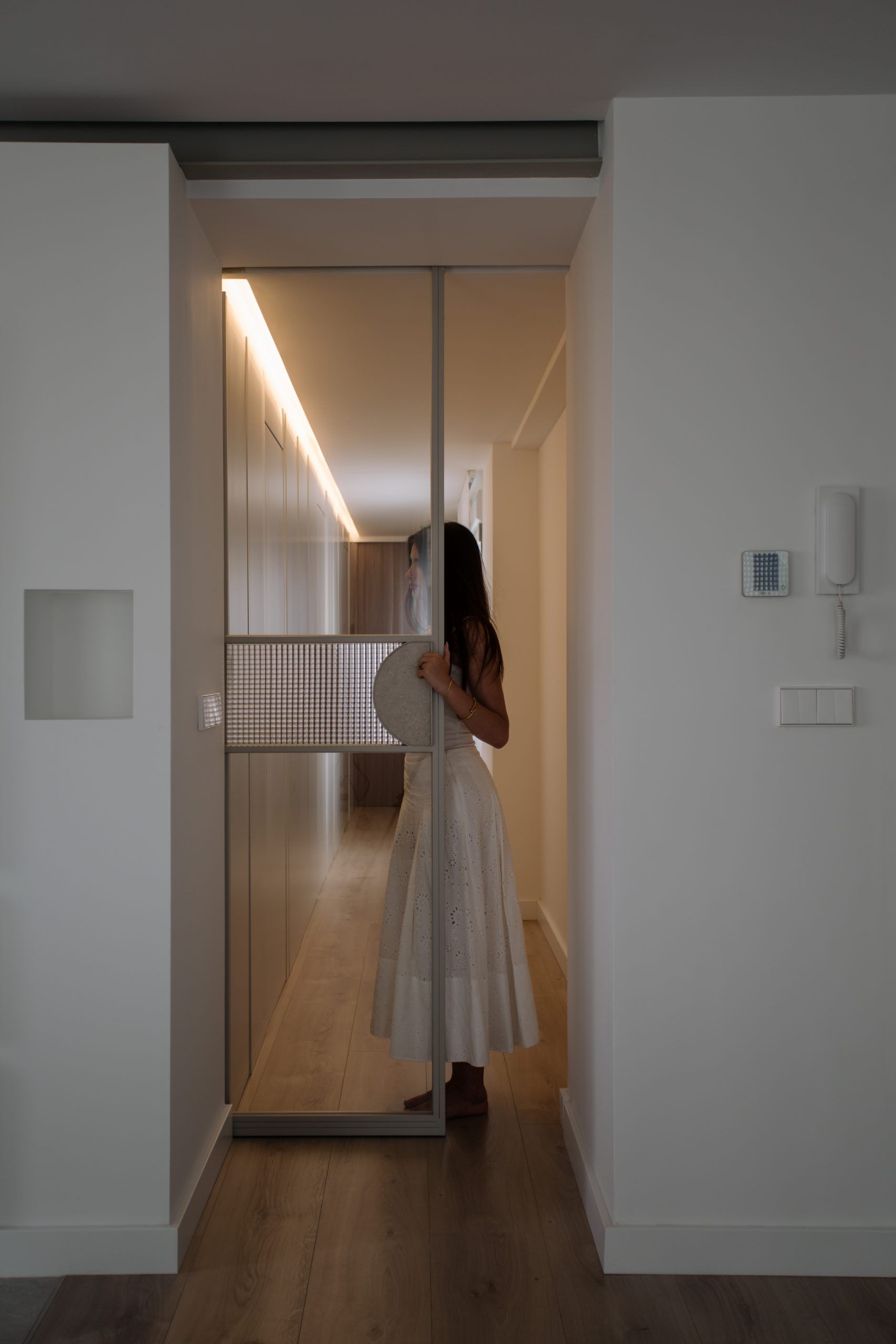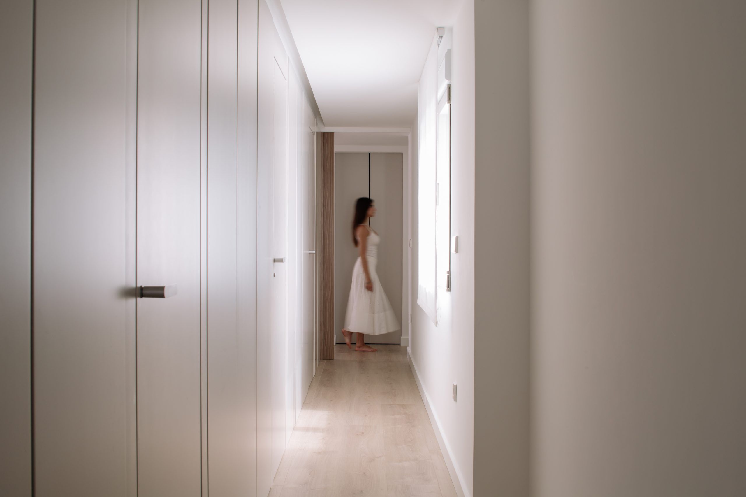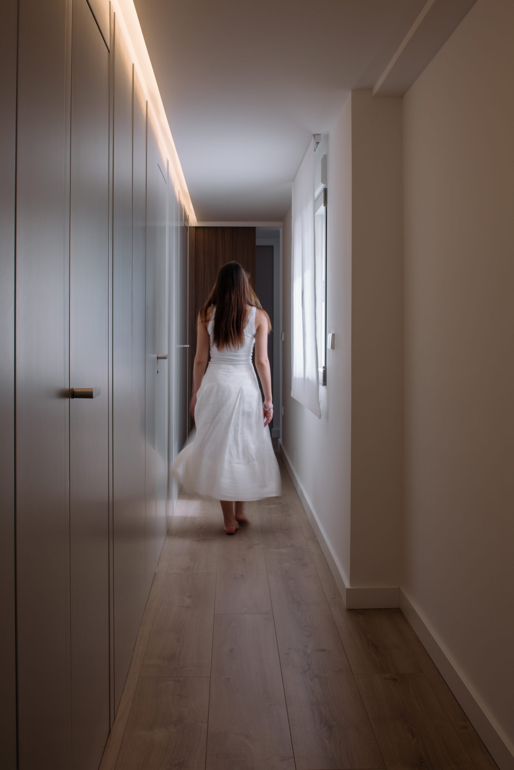 Uno de los puntos focales del proyecto es el pasillo distribuidor, concebido no como un mero elemento funcional, sino como una pieza esencial de diseño. Revestido con panelados de madera lacada que integran armarios de dos de las habitaciones, los cuales han sido reubicados en el pasillo y no dentro de las mismas, accesos a dormitorios, baño y vestidor, este corredor se presenta como una envolvente serena donde la linealidad es clave. Una línea de luz cálida, empotrada en la parte superior del panelado, genera un efecto de profundidad, separando sutilmente los materiales —pladur y madera— y reforzando el ritmo visual del conjunto.
