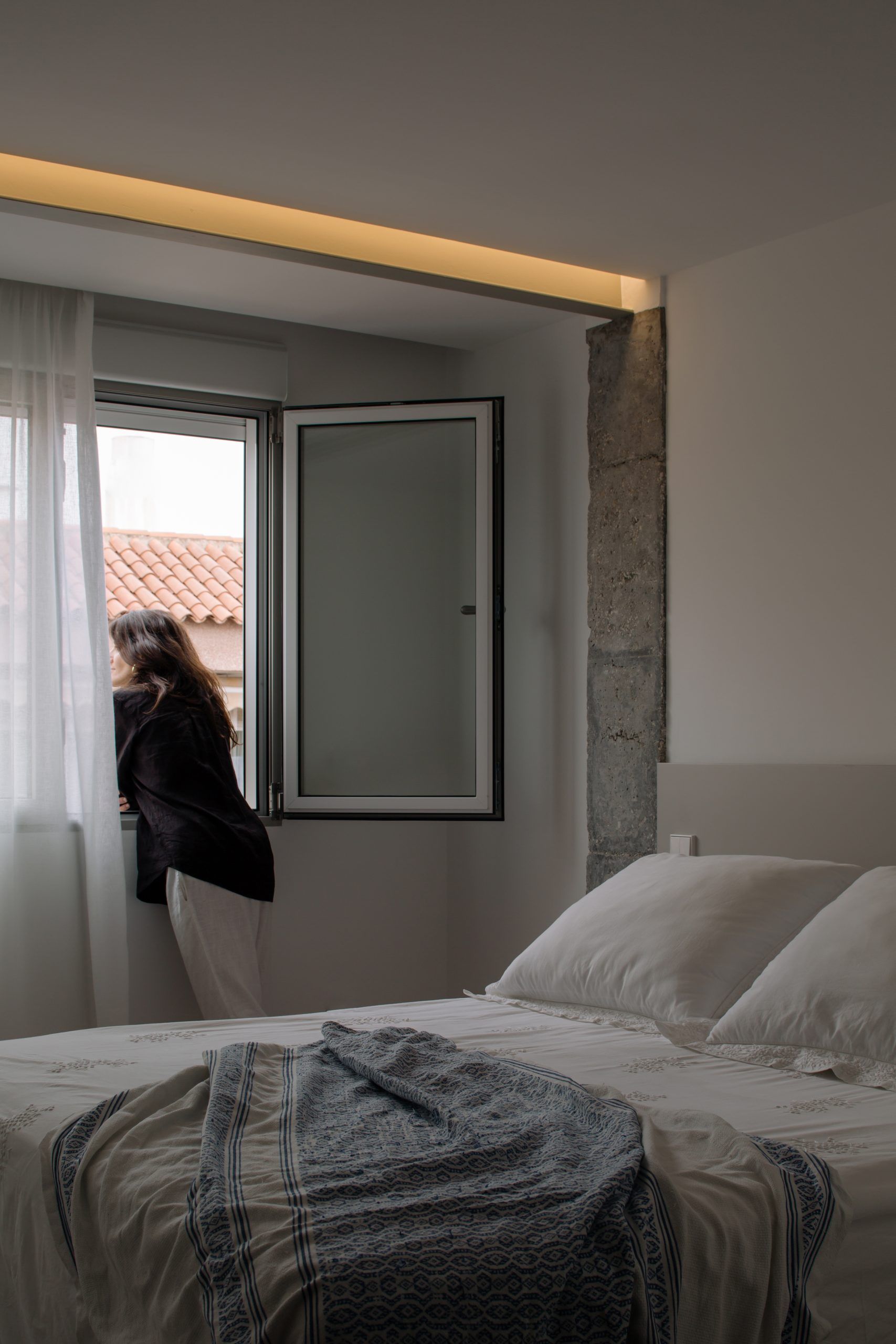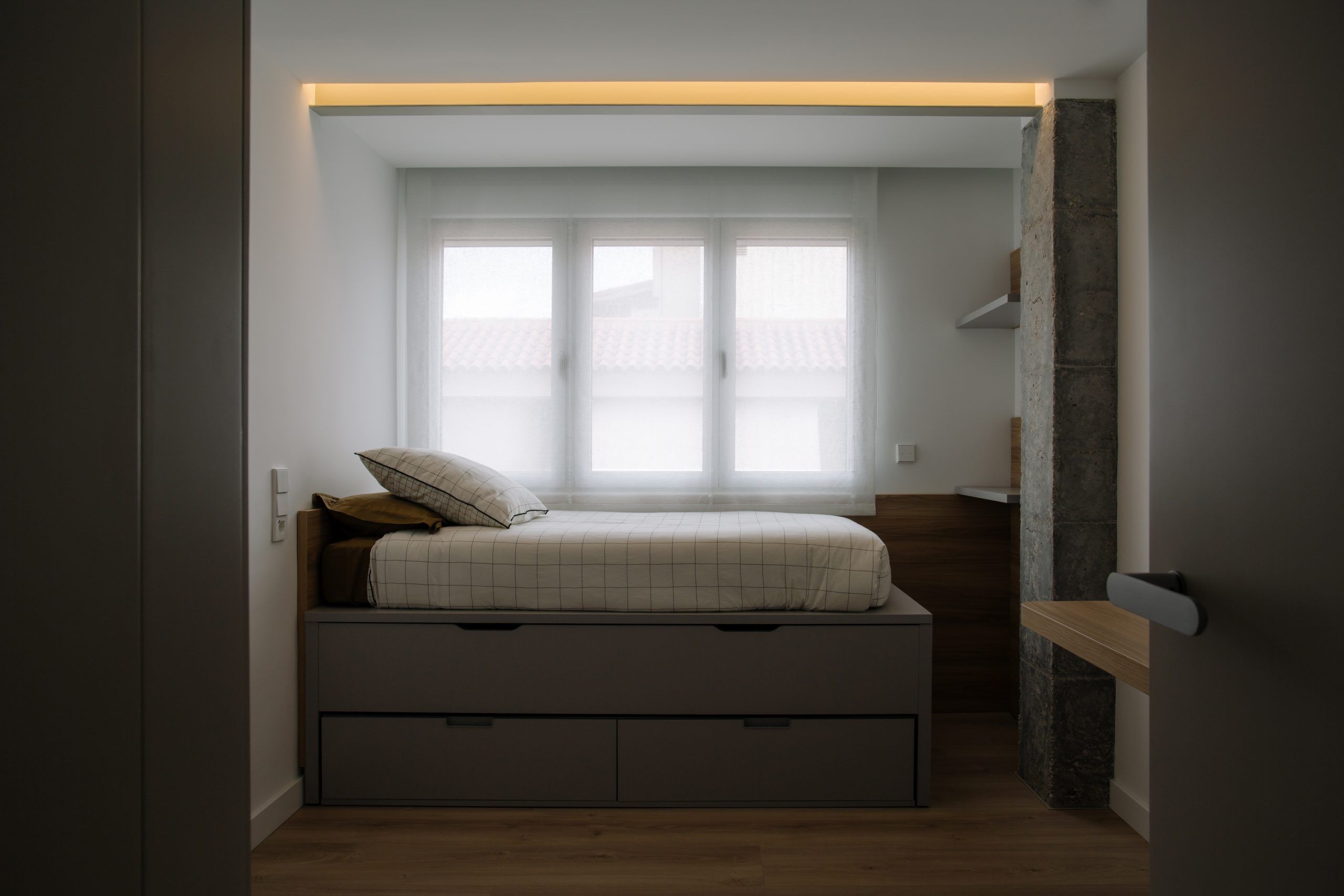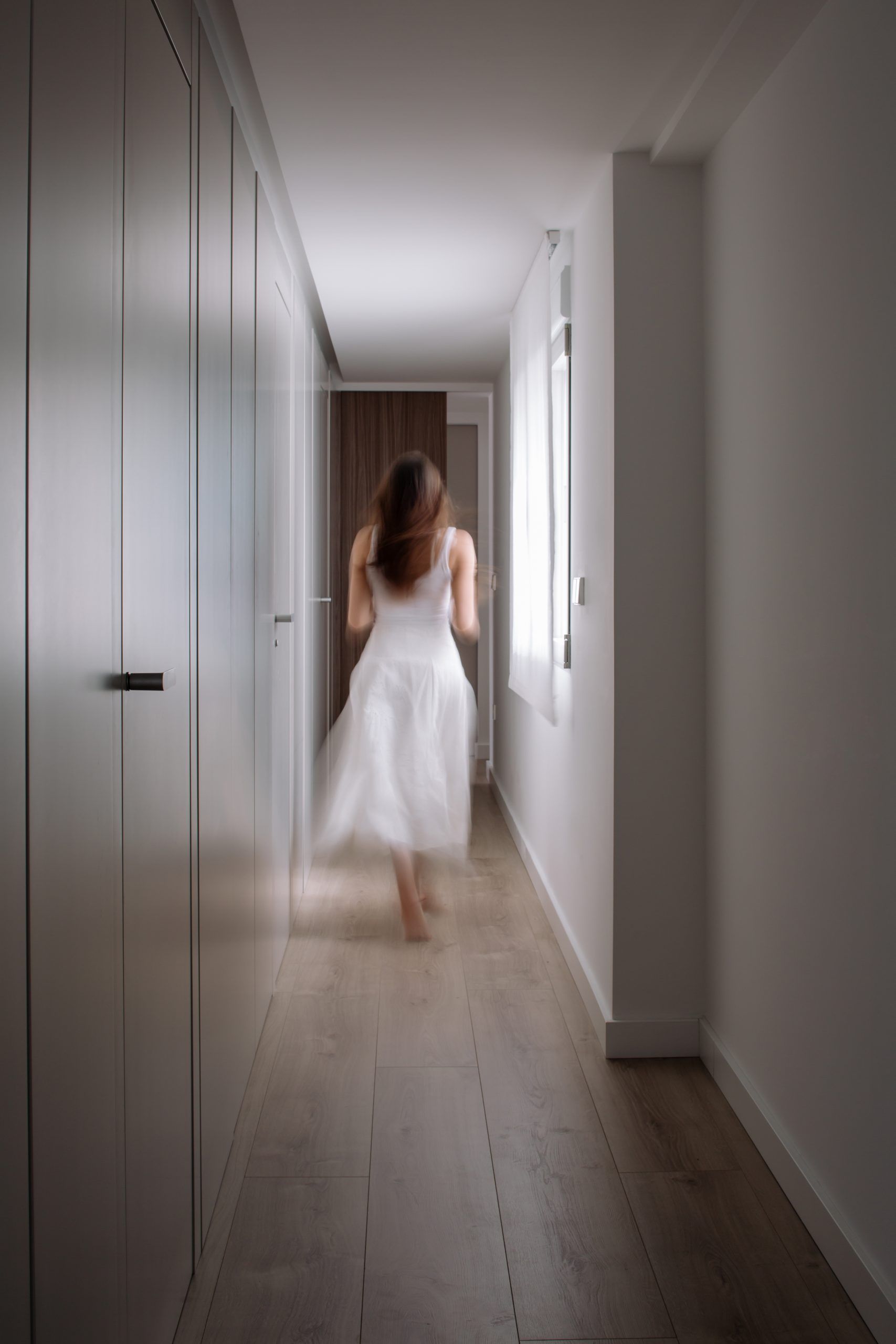 Uno de los puntos focales del proyecto es el pasillo distribuidor, concebido no como un mero elemento funcional, sino como una pieza esencial de diseño. Revestido con panelados de madera lacada que integran armarios de dos de las habitaciones, los cuales han sido reubicados en el pasillo y no dentro de las mismas, accesos a dormitorios, baño y vestidor, este corredor se presenta como una envolvente serena donde la linealidad es clave. Una línea de luz cálida, empotrada en la parte superior del panelado, genera un efecto de profundidad, separando sutilmente los materiales —pladur y madera— y reforzando el ritmo visual del conjunto.