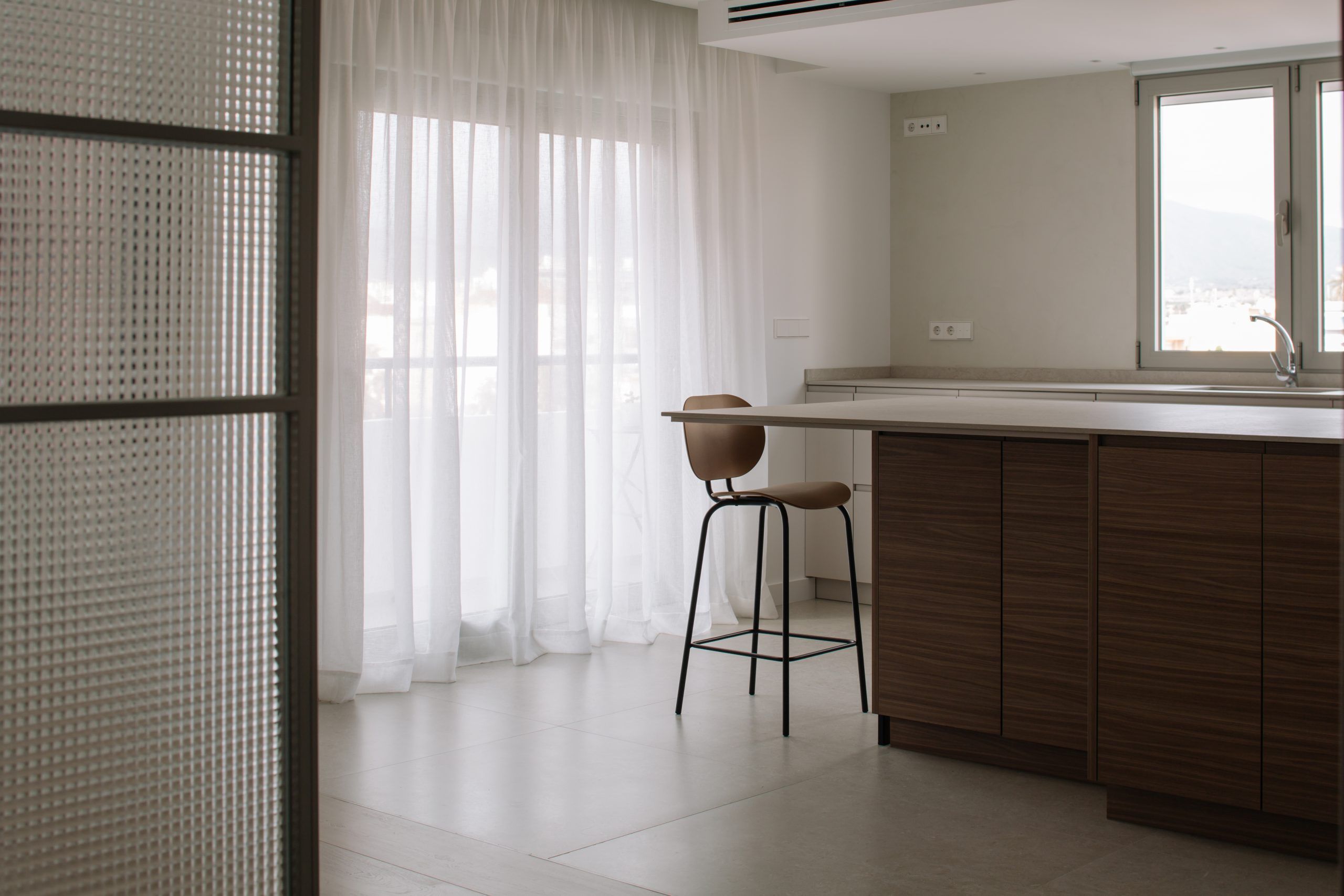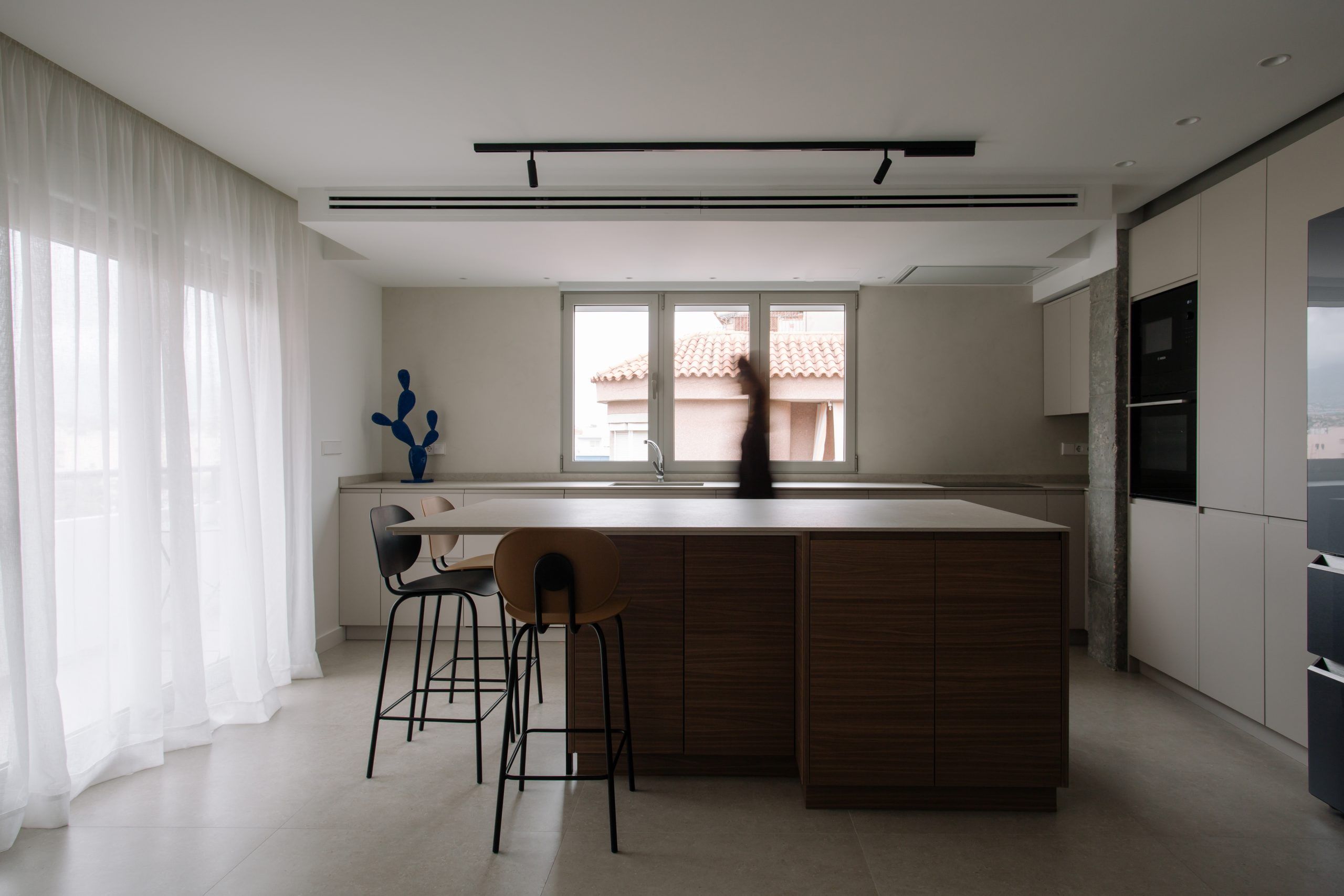 La cocina, abierta al salón pero delimitada por un cambio de pavimento (piedra y tarima de madera), se articula como otro de los ejes del hogar. Elena Yago reubica la cocina y consigue en la nueva distribución, más de cinco metros de bancada, isla central y una zona de almacenaje mural que responde con generosidad al uso cotidiano. La elección del material pétreo para encimeras y pavimento (Ber&Beren, de Living) conecta visualmente con las fachadas de la cercana finca Barbera, integrando el paisaje en el interior del hogar.