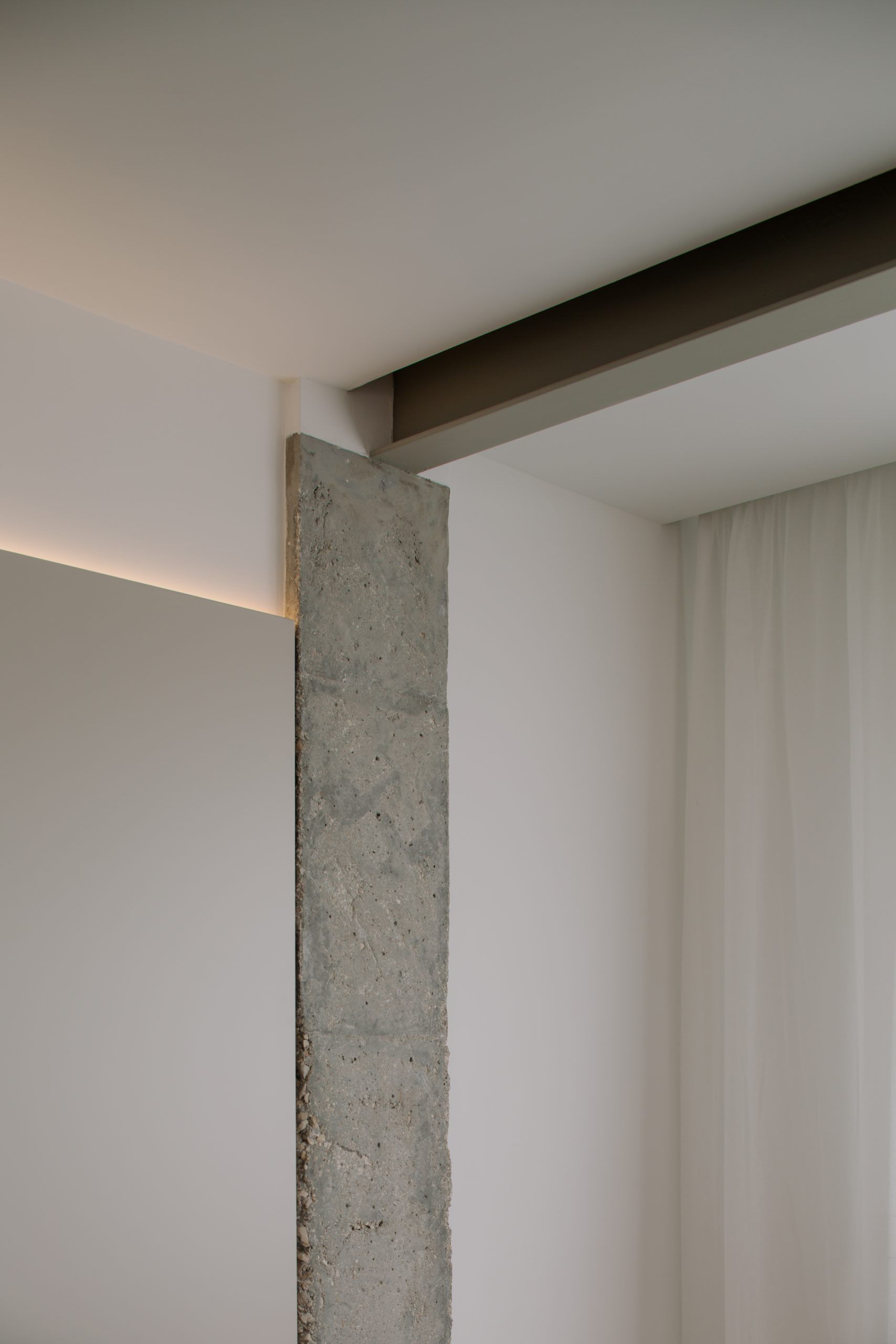 Hay en el espacio una sensación de orden y calma: superficies limpias, proporciones medidas, y una atmósfera envolvente que invita al recogimiento. La iluminación, tanto natural como artificial, juega un papel fundamental en la percepción espacial, aportando distintas cromáticas y ligereza según la hora del día. Y en parte se consigue un efecto lineal gracias a la ubicación de los retro iluminados que recorren toda la vivienda.